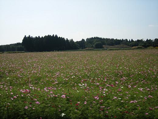 古墳の前は一面のコスモス畑です。14日に草刈に来たときはチラホラだったのが、六分咲きくらいでしょうか。
